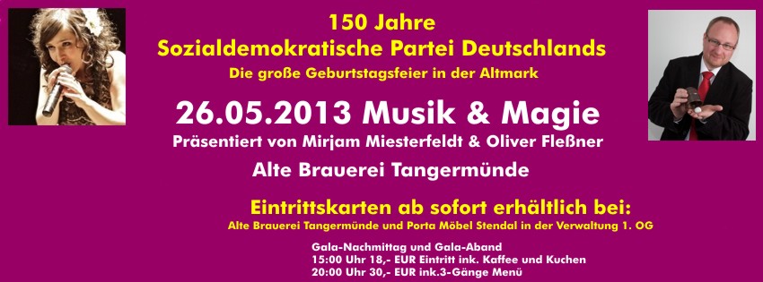 Die SPD feiert Geburtstag. Dieses Jubiläum wollen wir mit auch im Landkreis Stendal feiern. Dazu werden am 26. Mai 2013 zwei Veranstaltungen in der Alten Brauerei in Tangermünde stattfinden. Sie als Bürgerinnen und Bürger des Landkreis Stendal sind recht herzlich dazu eingeladen.